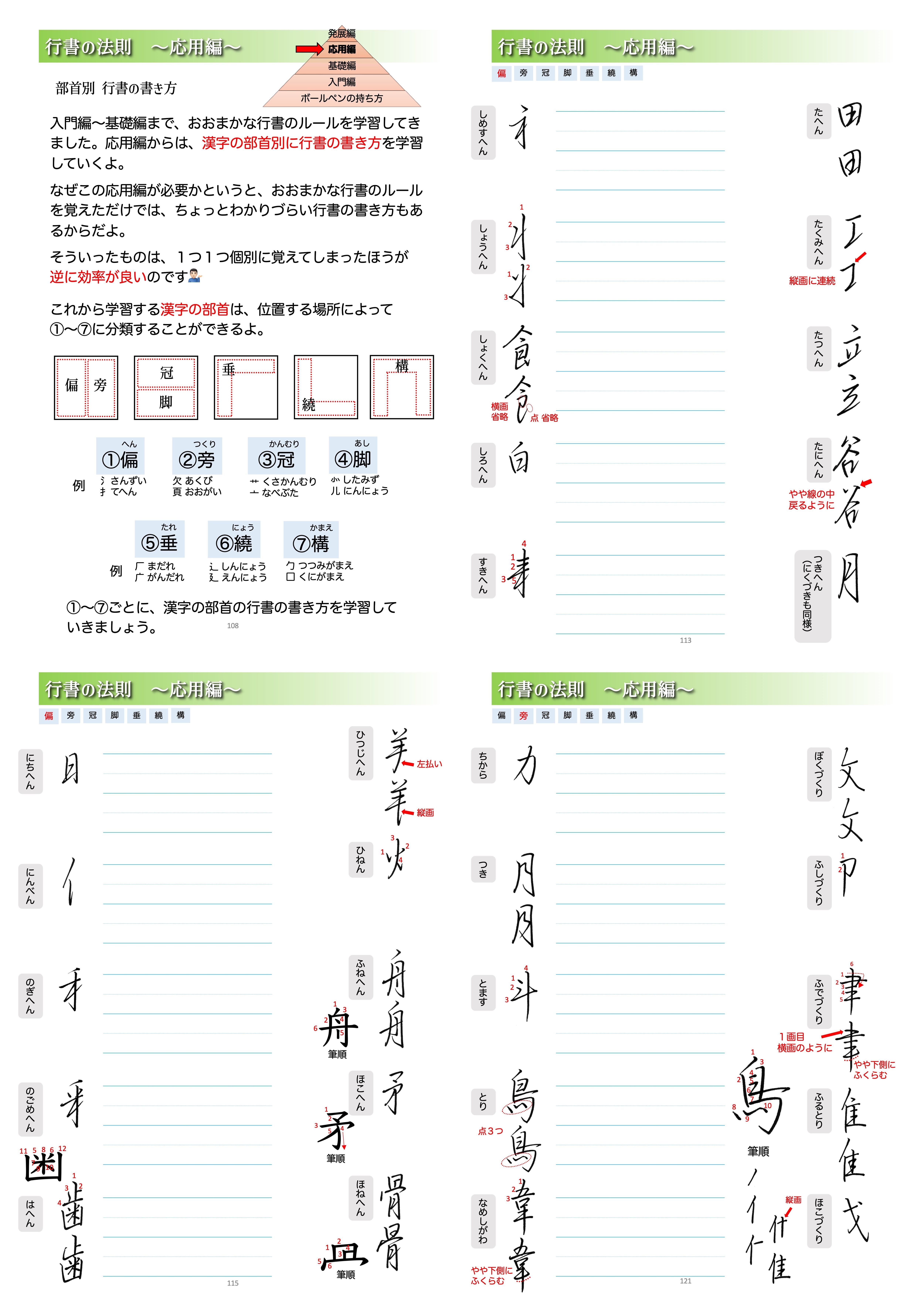 応用編では、入門編・基礎編で学んだ知識を以て、漢字の部首ごとの崩し方を覚えていきます。