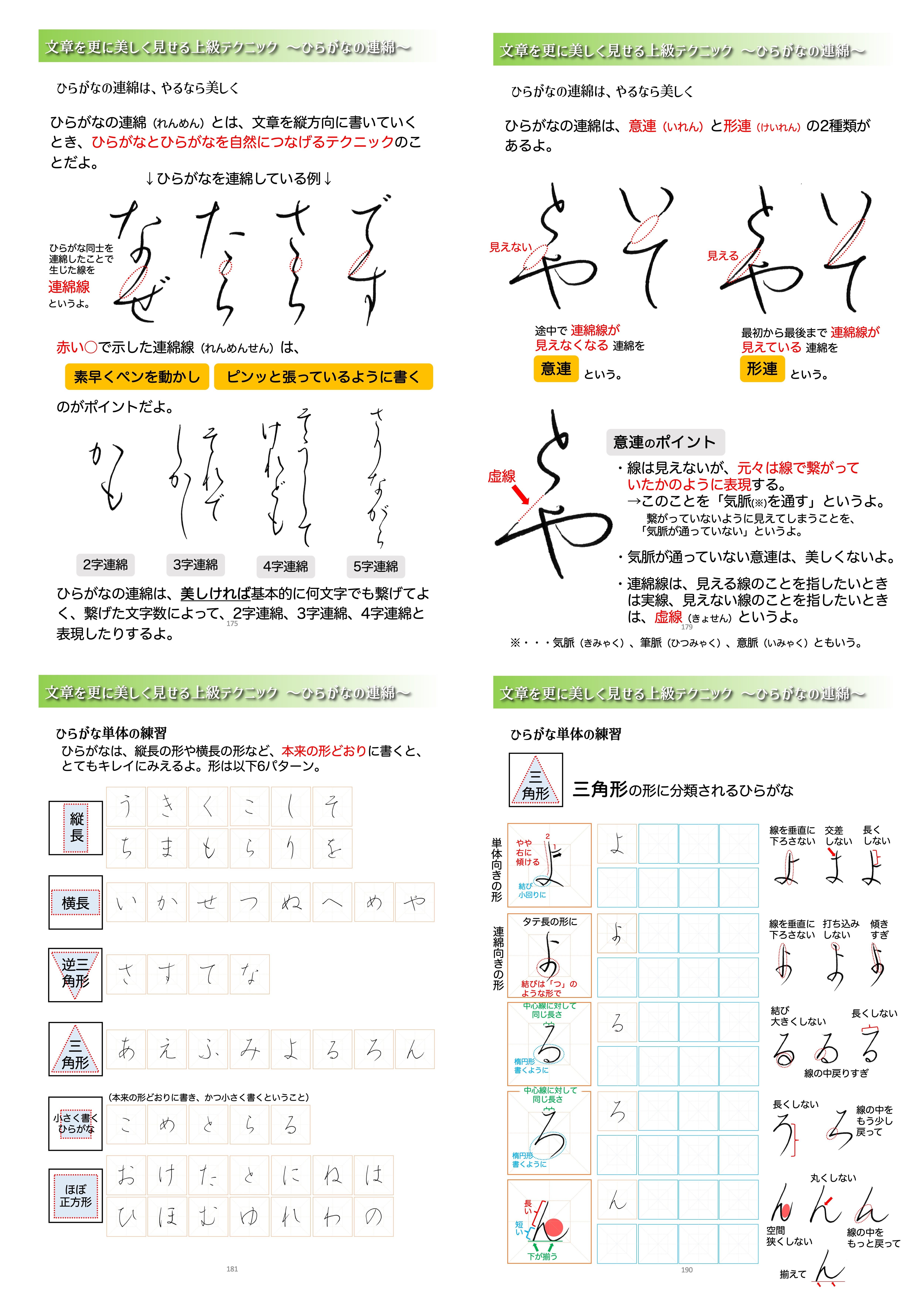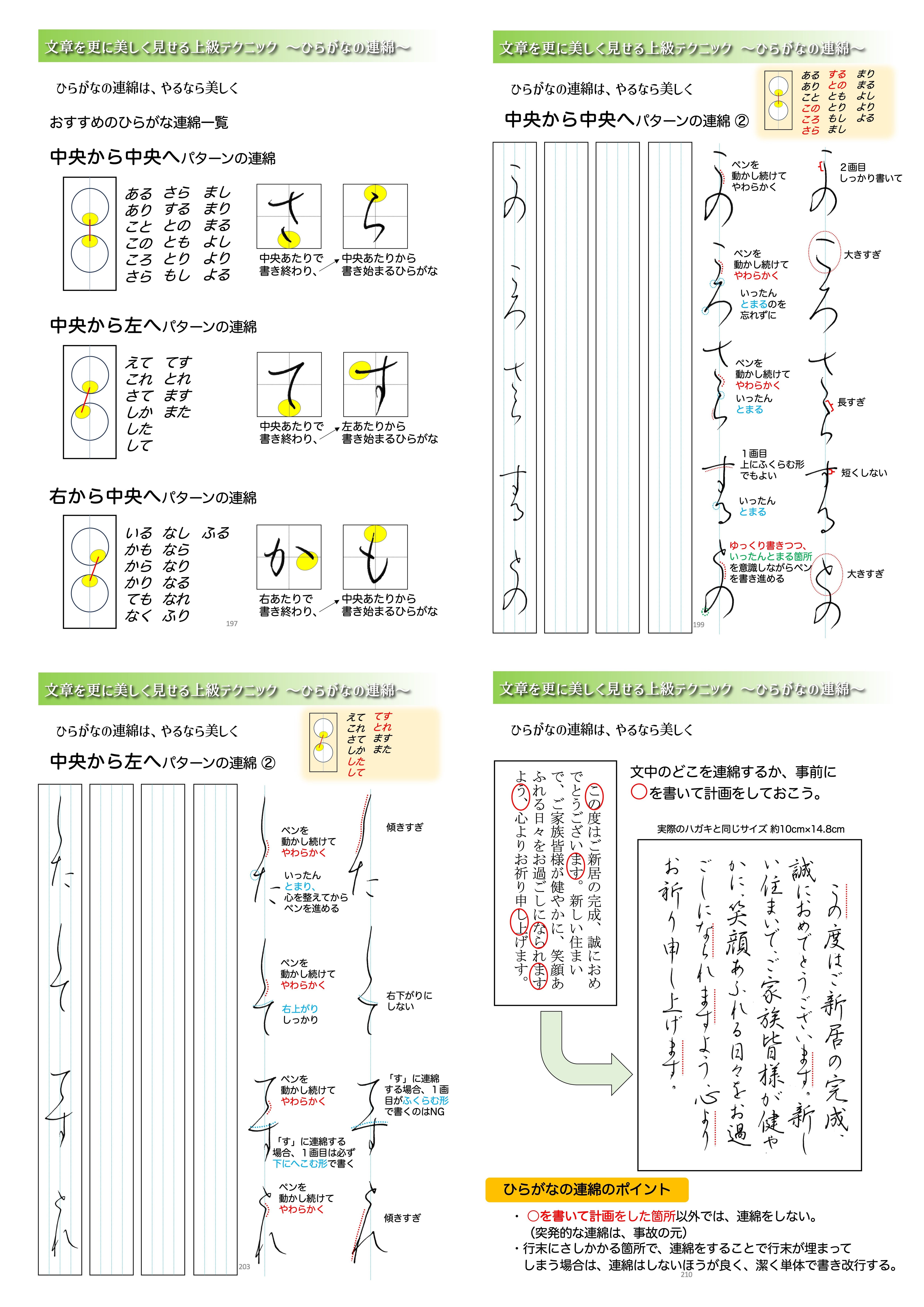 ひらがなの連綿についての考え方、おすすめのひらがなの連綿、よくあるひらがなの駄目な連綿例もタップリ掲載しています。