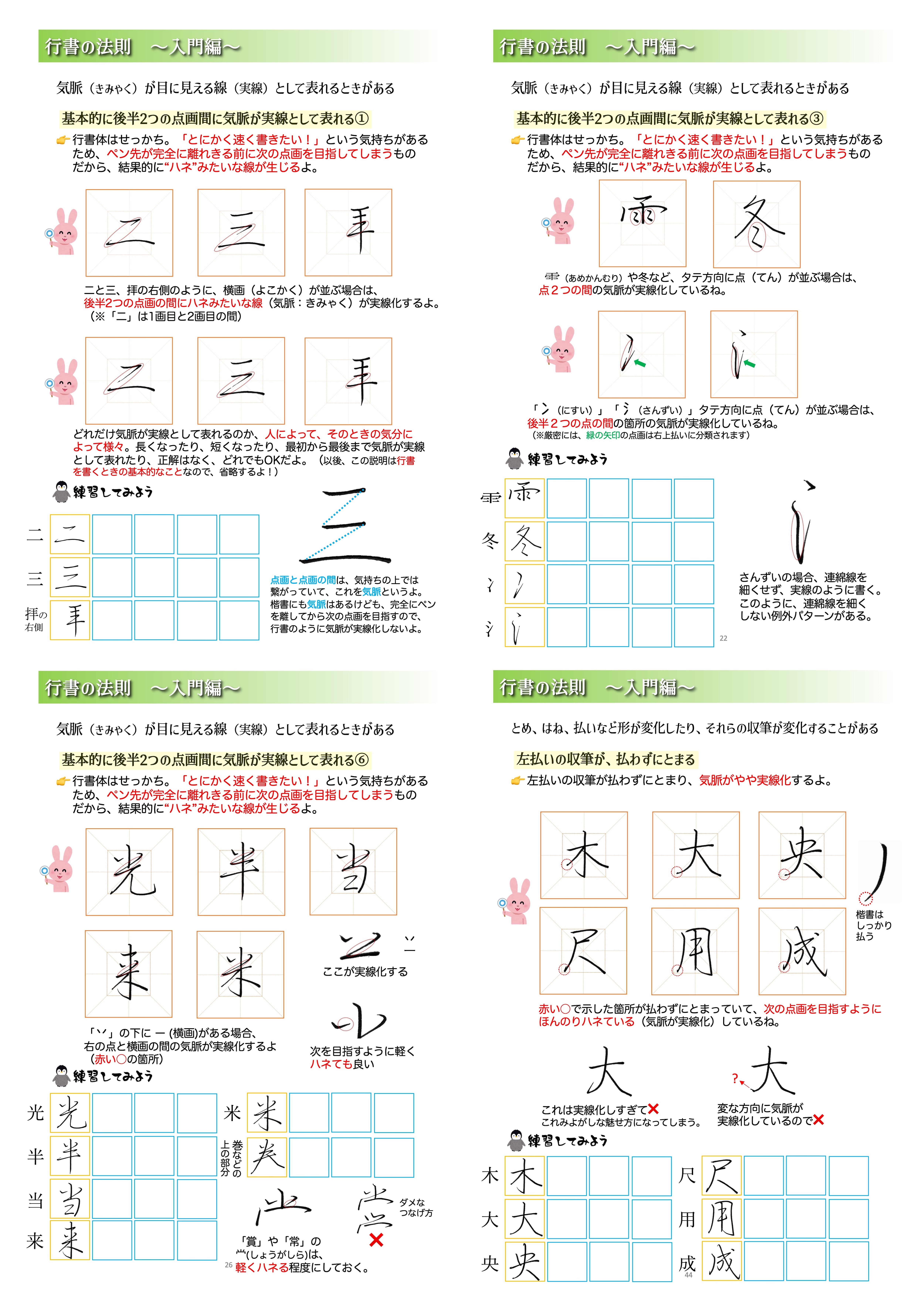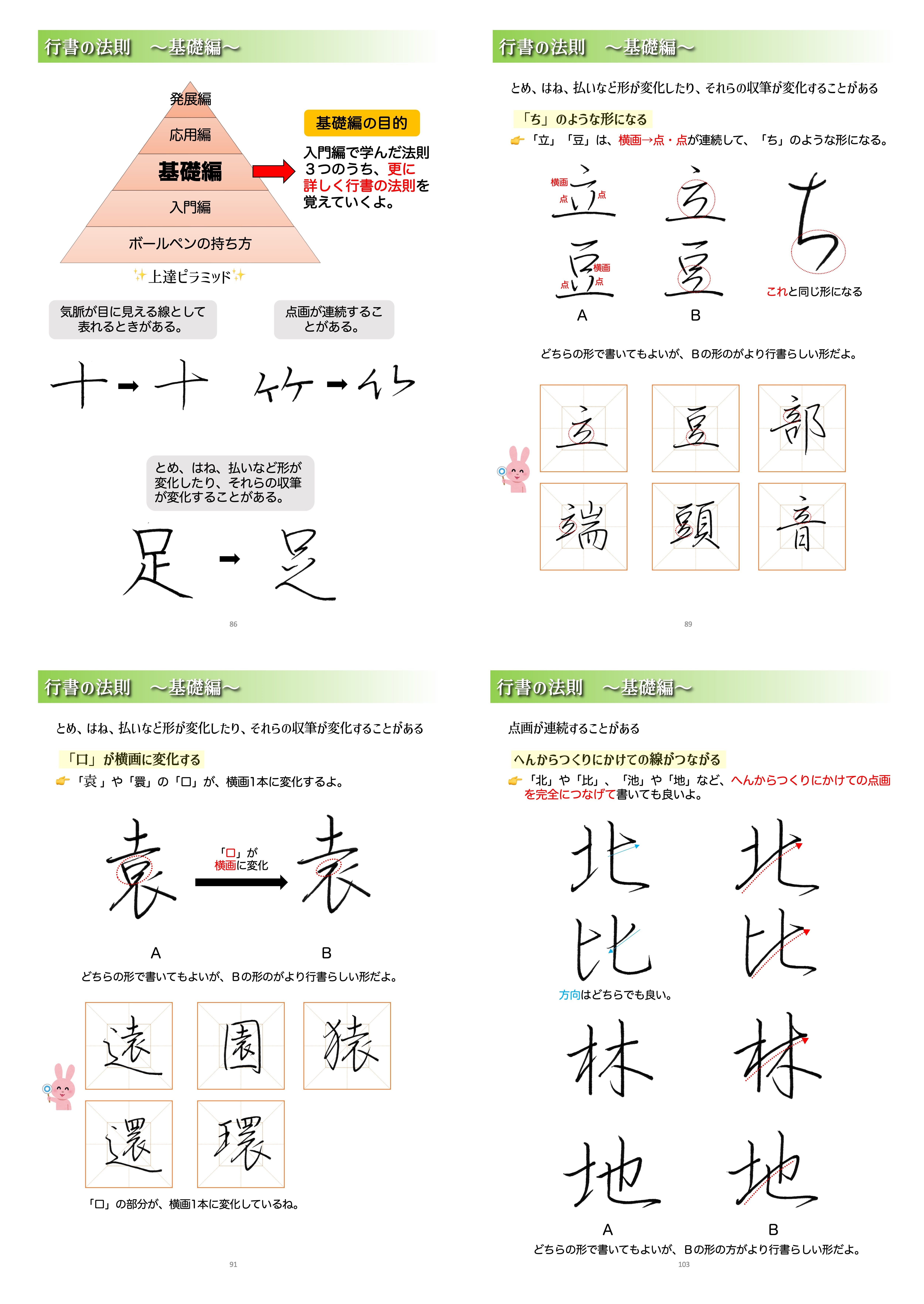 最初の段階である入門編、基礎編では、具体的な行書の法則について学びます。